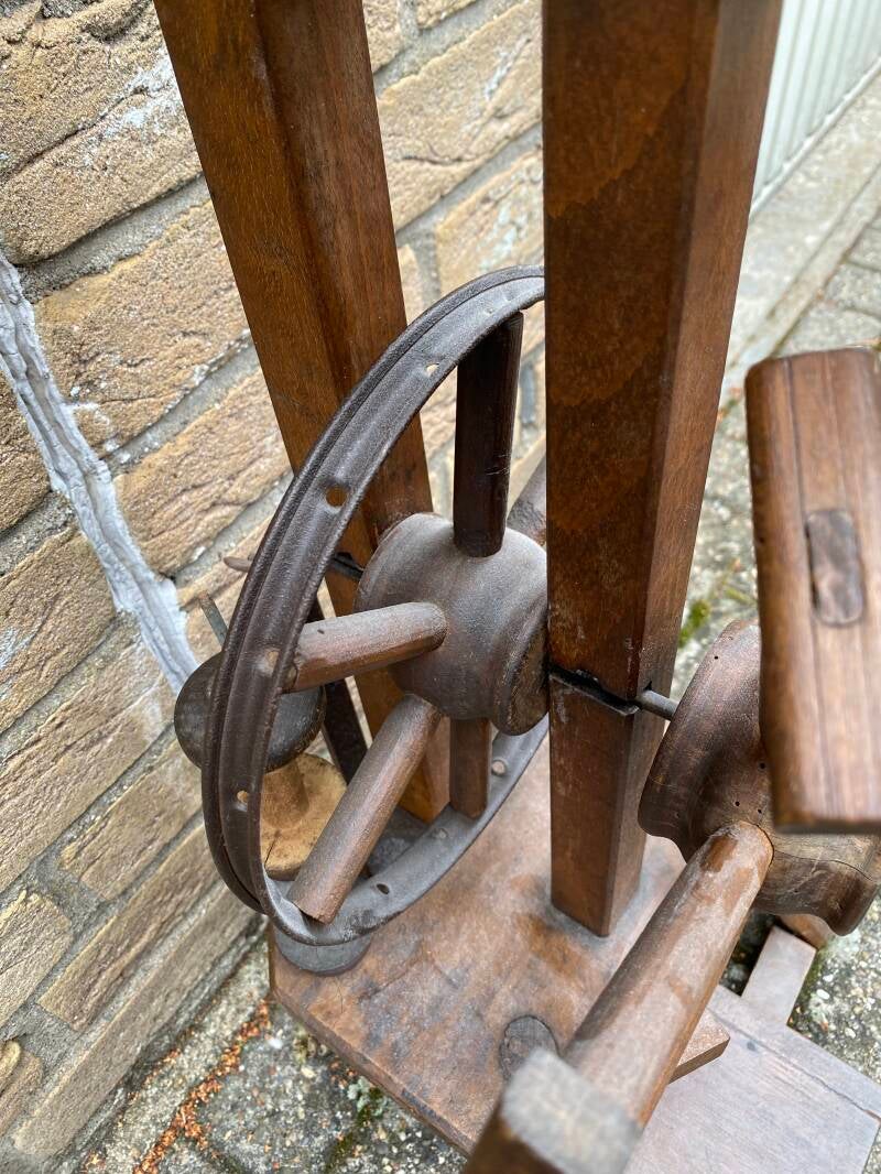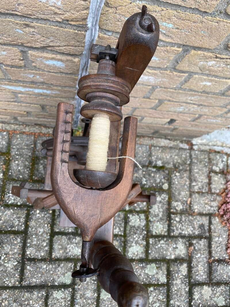 Alle Spulen waren beim Kauf mit gesponnener Schafwolle gefüllt, es scheint also gesponnen worden zu sein, war nicht nur Deko. Vorn hat das Rad eine Haspel. Der Antrieb ist 2-fädig und das Einzugsloch sehr klein.