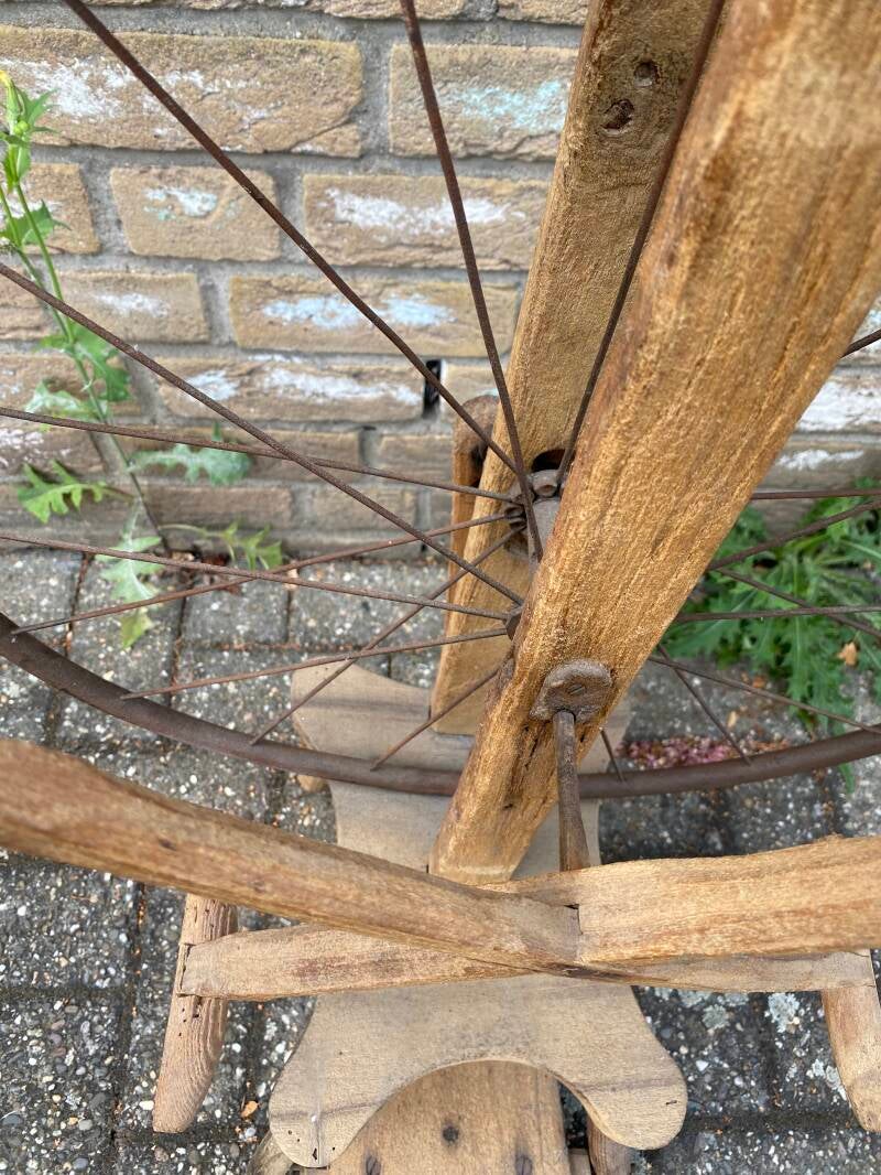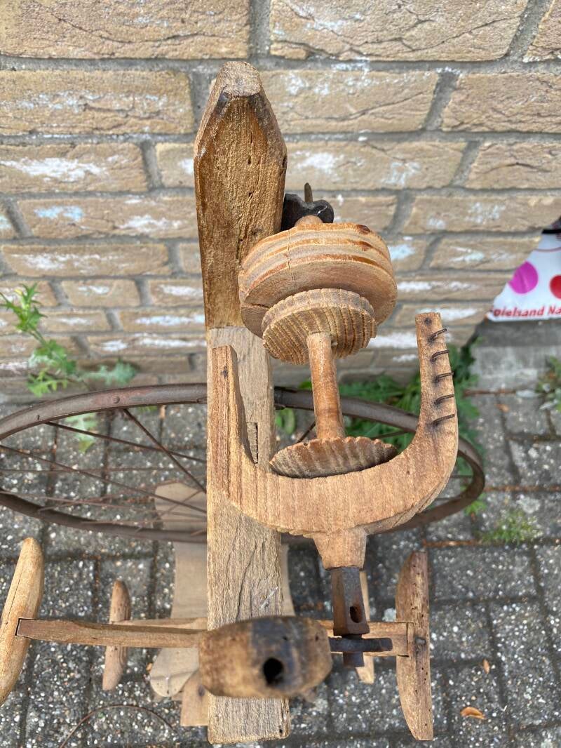Dieses Spinnrad stammt aus der Gegend um Bocholt. Vermutlich wurde es aus einem Rad eines Fahrrades selbst gebaut. Das Holz hat Wurmlöcher und eine sehr raue Oberfläche, fast zerklüftet, als hätte es im Wasser gelegen. Die Spule ist sehr klein, ebenso wir das Einzugsloch, also eventuell für sehr feines gedacht. Der Antrieb ist 2-fädig. Die vorn angesteckte Haspel ist locker und wackelig.