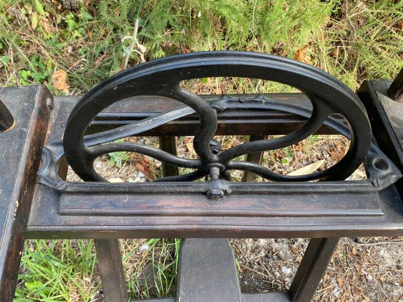Das Rad sieht so aus, als stamme es von einer Nähmaschine. Auf dem Bild fehlt der Wirbel, es ist ein 2-fädiges Rad. Das Holzstück, auf dem der Spinnkopf sitzt, wird nur mit einer Flügelmutter fixiert, was eine Fadenspannung und die Einstellung des Einzugs schwierig macht. Das Einzugsloch ist sehr klein.