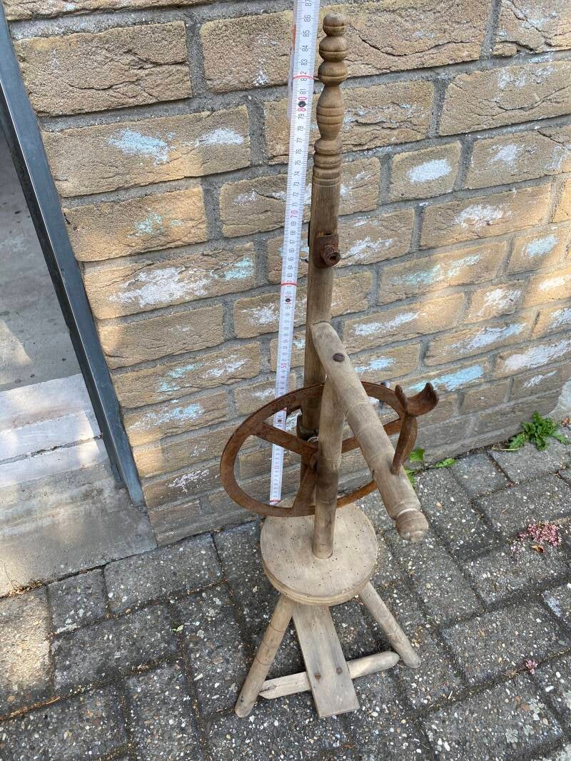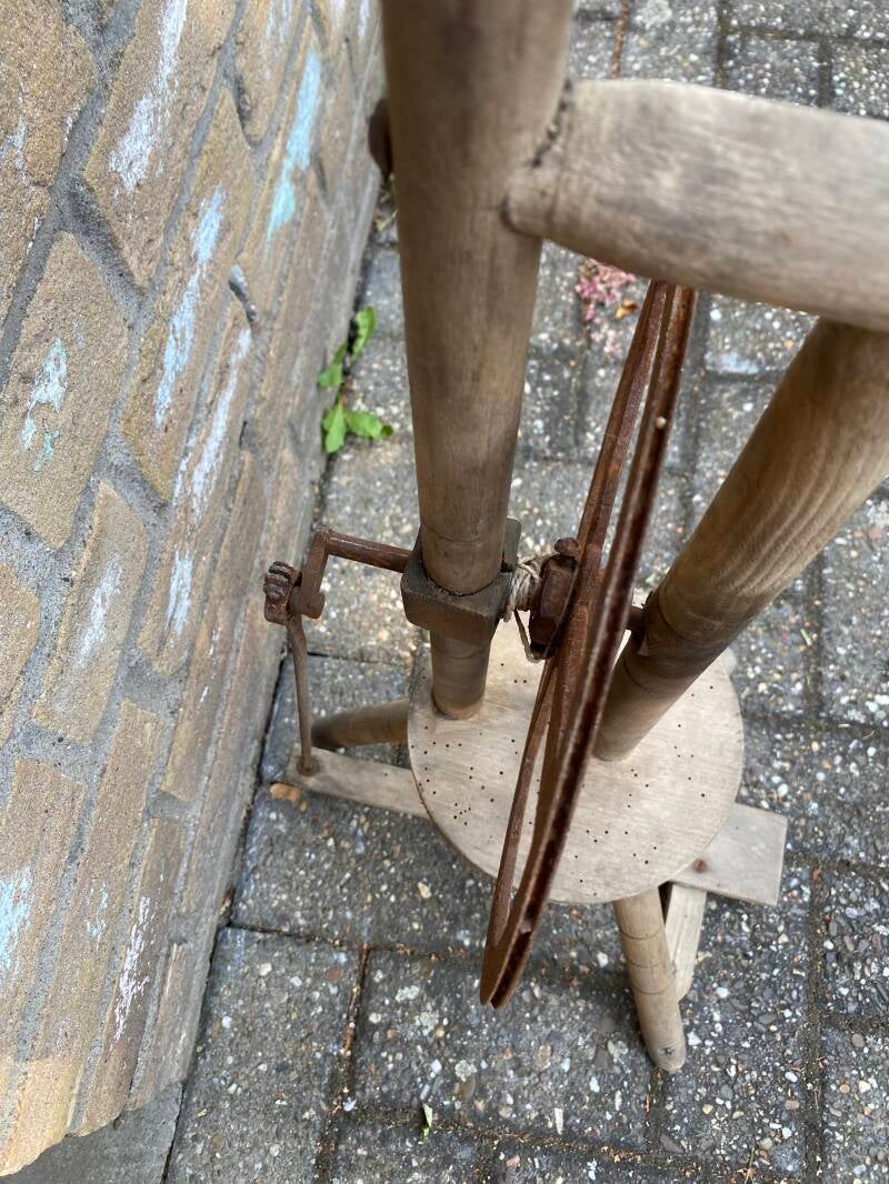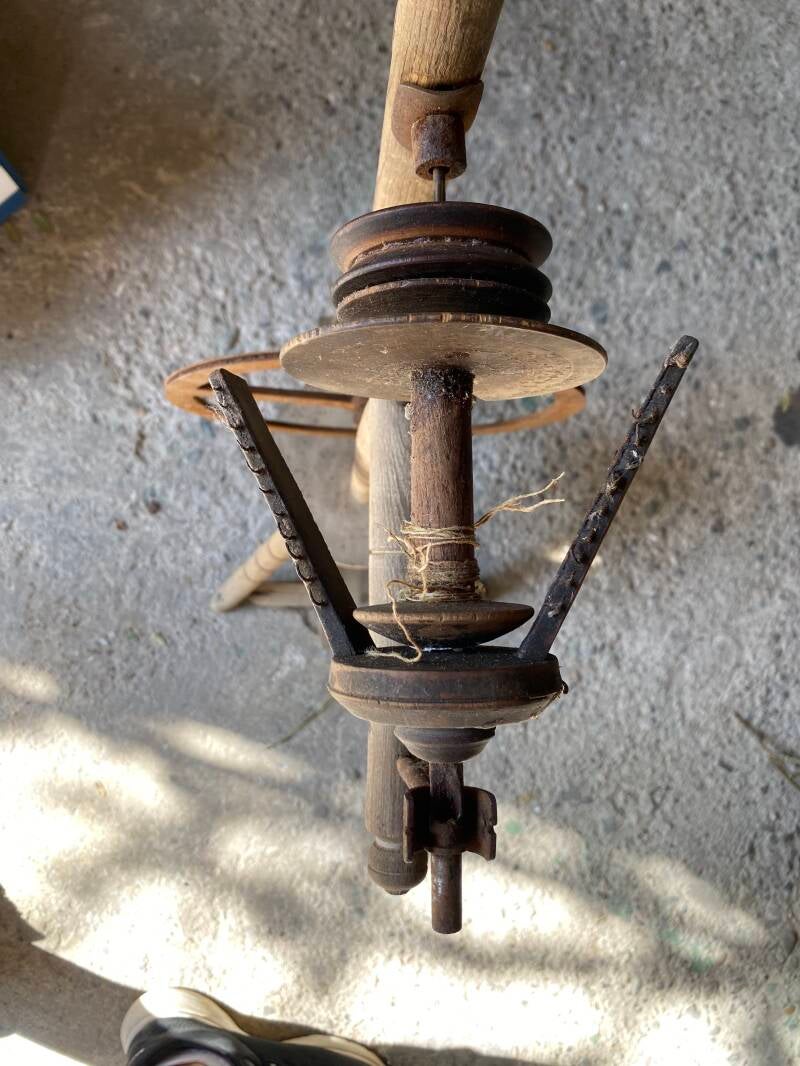 Der Flügel fehlt leider, aber ich habe in meiner Grabbelkiste einen gefunden, den ich eventuell anpassen kann, damit es wieder genutzt werden kann. Der Antrieb ist auf jeden Fall einfältig, weil die Rille des Schwungrades sehr schmal ist und der Faden abspringen würde bei 2-fädigem Antrieb. Vermutlich ist es Flügelgebremst, vorn ist ein Loch, in dem die Bremse angebracht worden sein könnte.